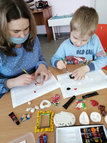 Инструктор творческой мастерской «Керамика» Алимовой С.В.  провела для детей с ментальными нарушениями мастер – класс «Цветная керамика» по росписи гипсовых магнитов. Собачки, белочки, зайки, машинки превращались в красочные, яркие магнитики, которыми юные художники, наверняка, украсят свои холодильники в память о замечательном мастер-классе.