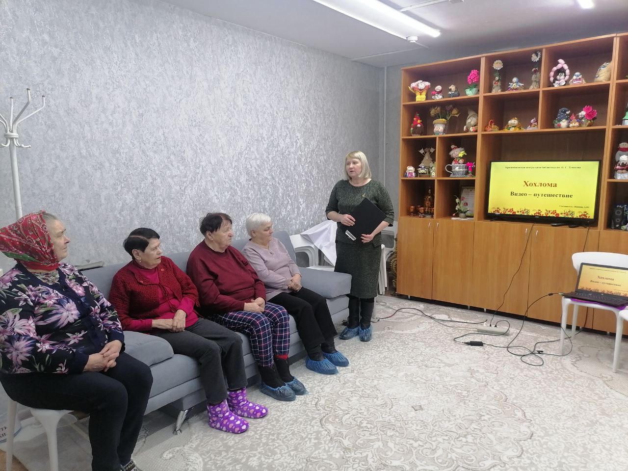 В отделении «Специализированный жилой дом для граждан пожилого возраста и инвалидов» ГБУ «КЦСОН Краснобаковского муниципального округа» состоялся библиотечный час «Хохлома: видео-путешествие».